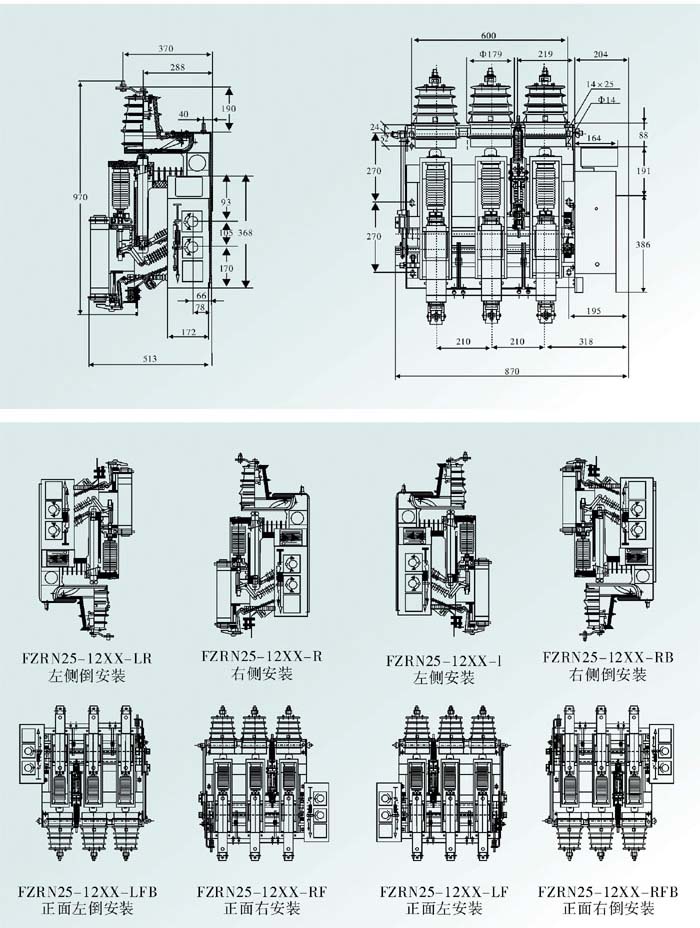 FZRN25-12型真空負荷開關和FZRN25-12型組合電器、總體結構采用操作機構布置于主回路側面的形式。(可根據(jù)用戶需求提供主回路右、左側面或正面的形式)。主導電部分由絕緣罩、靜觸頭、活門、導電筒、真空滅弧室等構成,組合電器還有限流熔斷器。