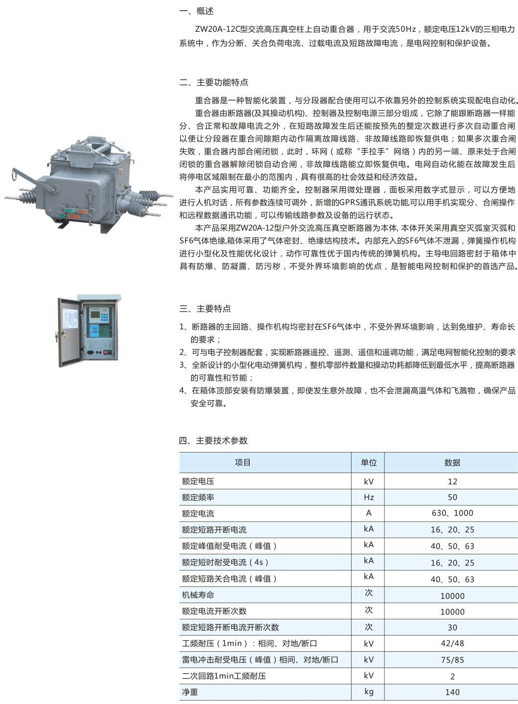 • ZW20A-12C交流高壓真空柱上自動重合器