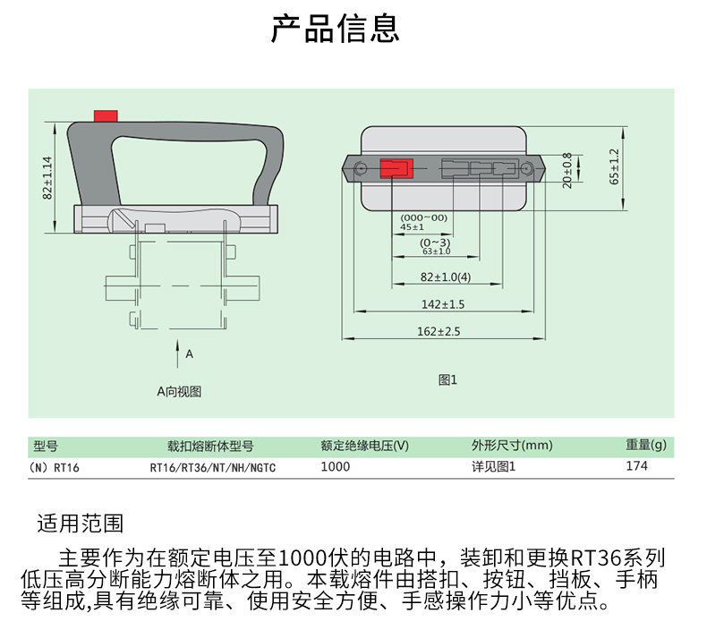 載熔件主要用于RT16、RT36、NT00、NT1、NT2、NT3、NH、RS71C等系列刀型觸頭熔斷體的裝卸或更換。